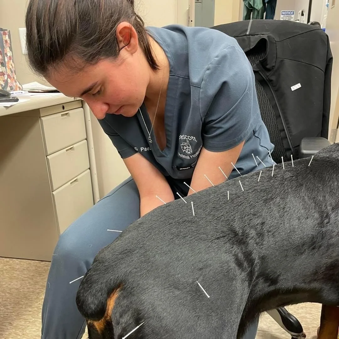 As an integrative approach to animal medicine and well being, Dr. Knoepfli and Dr. Paez are able offer acupuncture. Acupuncture is the ancient Chinese practice of inserting needles in specific points on the body to manipulate the flow of Qi (energy), release endorphins, and encourage healing. Acupuncture is mostly commonly used to help treat pain, mobility and inflammation in conjunction with supplements, pain medications, or physiotherapy depending on your pet's individual needs.